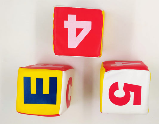 Enfant 4 inch Square Dice Baby Toddler Soft Toy Set with letters and alphabet 3 Pcs